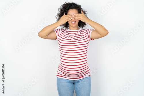 young pregnant woman wearing striped t-shirt over white background covering eyes with hands smiling cheerful and funny. Blind concept.