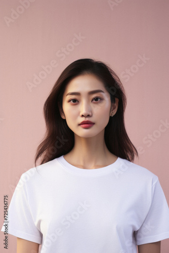 Young pretty Asian woman model wearing tshirt looking at camera standing on color background. Face skin care korean cosmetic and makeup, fashion ads. Beauty portrait. White t-shirt mock up template .