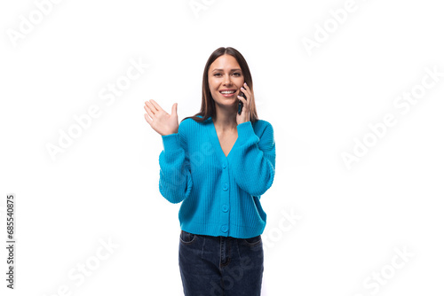 young pretty brunette lady dressed in a blue V-neck sweater speaks in a smartphone on a white background with copy space