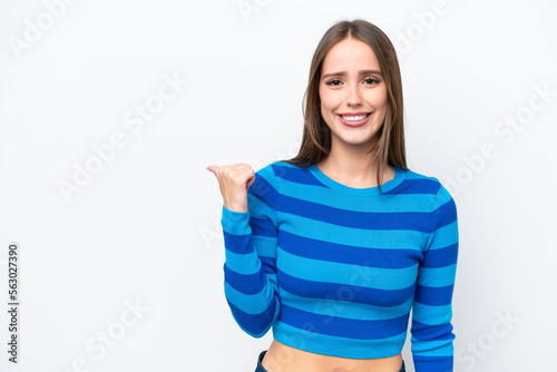 Young pretty caucasian woman isolated on white background pointing to the side to present a product