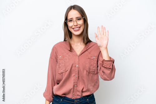 Young pretty caucasian woman isolated on white background saluting with hand with happy expression