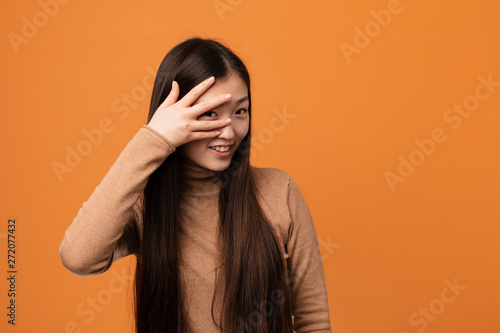 Young pretty chinese woman blink at the camera through fingers, embarrassed covering face.