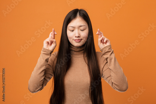 Young pretty chinese woman crossing fingers for having luck
