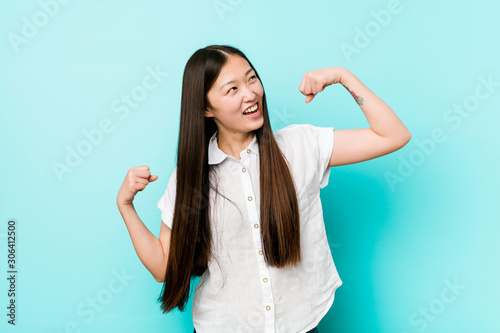 Young pretty chinese woman raising fist after a victory, winner concept.