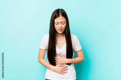 Young pretty chinese woman sick, suffering from stomachache, painful disease concept.