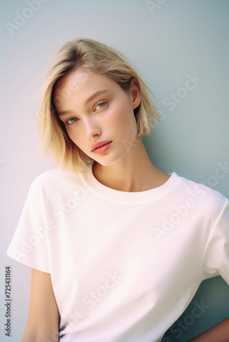 Young pretty cool trendy woman gen z model wearing tshirt looking at camera standing on color background. Face skin care cosmetics makeup, fashion ads. Beauty portrait. White t-shirt mock up template.