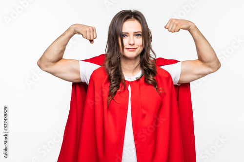 Young pretty couple in red hero look showing arm muscle isolated on white background