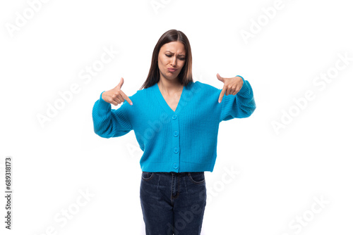 young pretty european brunette woman dressed in a blue button-down sweater on a white background with copy space
