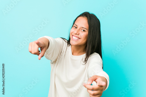 Young pretty hispanic woman cheerful smiles pointing to front.
