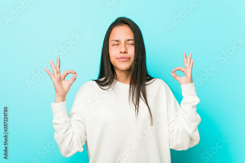 Young pretty hispanic woman relaxes after hard working day, she is performing yoga.