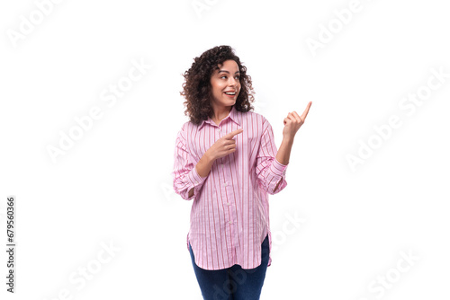 young pretty lady with curly black hair in a pink blouse points her hand to the side