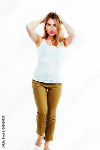 young pretty stylish hipster girl posing emotional isolated on white background happy smiling cool smile, lifestyle people concept close up