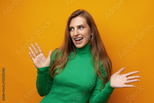 Young pretty surprised smiling woman standing with open palms on yellow background