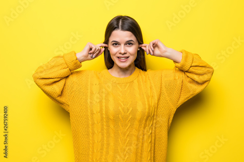 Young pretty woman closed ears for noise wearing in yellow sweater isolated on yellow background