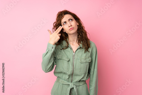 Young pretty woman over isolated pink background with problems making suicide gesture