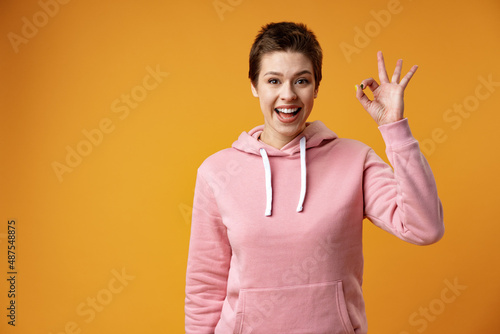 Young pretty woman over isolated yellow background showing ok sign