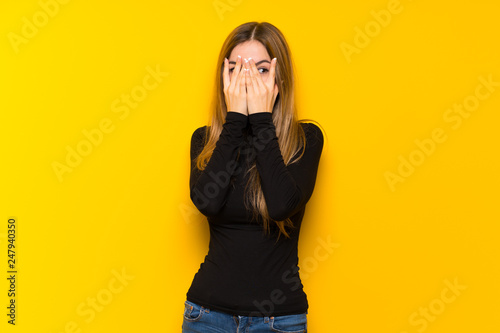 Young pretty woman over yellow background covering eyes by hands and looking through the fingers