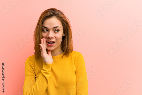 Young pretty young woman is saying a secret hot braking news and looking aside