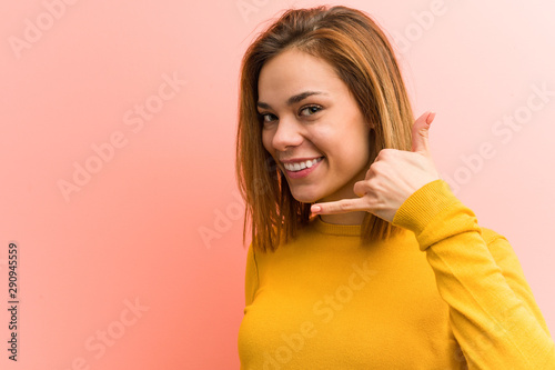 Young pretty young woman showing a mobile phone call gesture with fingers.