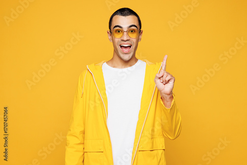 Young proactive middle eastern man he wear raincoat casual clothes sunglasses holding index finger up with great new idea isolated on plain yellow orange background studio portrait. Lifestyle concept