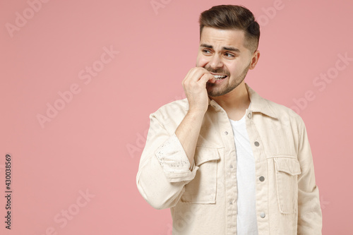 Young puzzled troubled pensive trendy caucasian man 20s wearing jacket white t-shirt biting nails fingers look aside isolated on pastel pink color background studio portrait. People lifestyle concept.