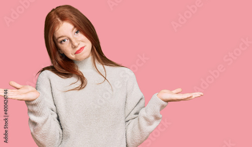 Young read head woman wearing casual winter sweater clueless and confused expression with arms and hands raised. doubt concept.