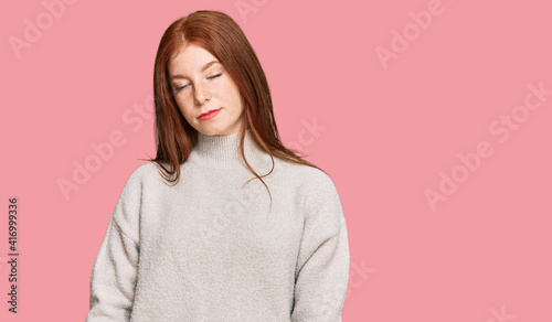 Young read head woman wearing casual winter sweater with serious expression on face. simple and natural looking at the camera.