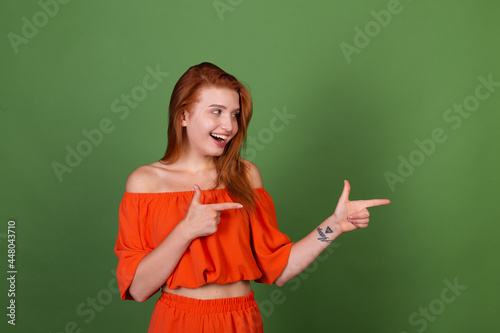 Young red hair woman in casual orange blouse on green background smile and laugh point right
