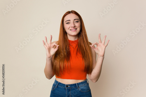 Young red hair woman isolated cheerful and confident showing ok gesture.