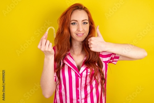 Young red haired woman wearing pink pyjama over yellow studio background holding an invisible braces aligner and rising thumb up, recommending this new treatment. Dental healthcare concept.