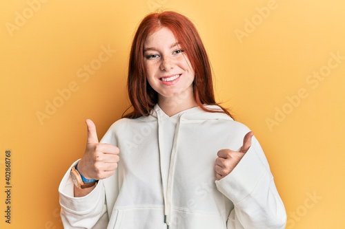 Young red head girl wearing casual sweatshirt success sign doing positive gesture with hand, thumbs up smiling and happy. cheerful expression and winner gesture.