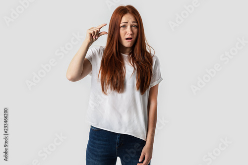 Young red-haired girl isolated on gray background in white t-shirt. Shows a gesture with his hands small price. The concept of a small percentage and salary and price. She is surprised