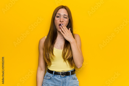 Young redhead ginger woman with freckless yawning showing a tired gesture covering mouth with hand.