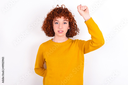 young redhead girl wearing yellow sweater over white background feeling serious, strong and rebellious, raising fist up, protesting or fighting for revolution.