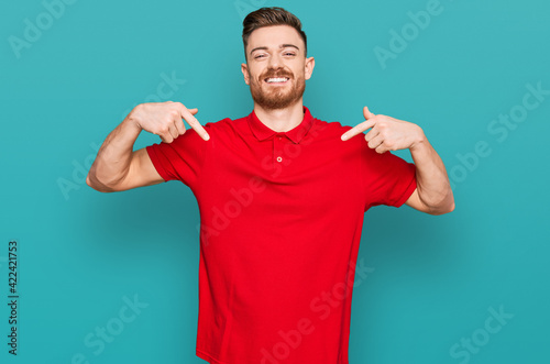 Young redhead man wearing casual clothes looking confident with smile on face, pointing oneself with fingers proud and happy.