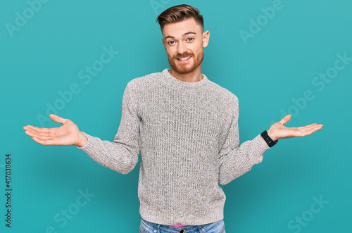 Young redhead man wearing casual winter sweater smiling showing both hands open palms, presenting and advertising comparison and balance