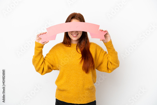 Young redhead woman isolated on white background holding an empty placard and hiding behind it
