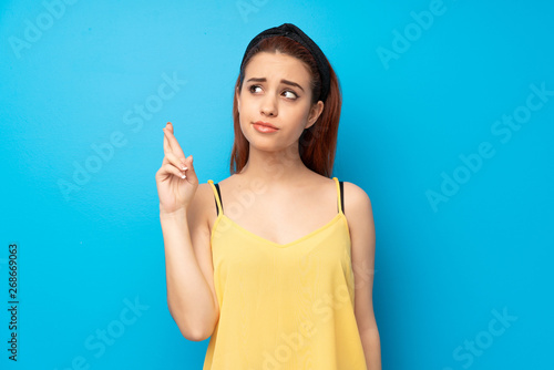 Young redhead woman over blue background with fingers crossing and wishing the best