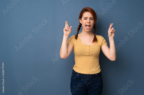 Young redhead woman over blue background with fingers crossing and wishing the best