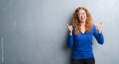 Young redhead woman over grey grunge wall success sign doing positive gesture with hand, thumbs up smiling and happy. Looking at the camera with cheerful expression, winner gesture.