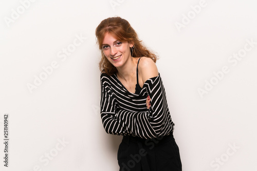 Young redhead woman over white wall keeping the arms crossed while smiling