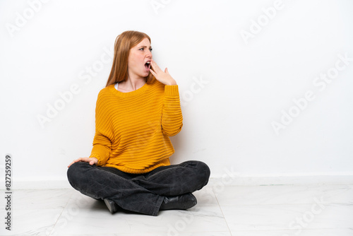 Young redhead woman sitting on the floor isolated on white background yawning and covering wide open mouth with hand