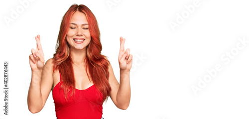 Young redhead woman wearing casual clothes gesturing finger crossed smiling with hope and eyes closed. luck and superstitious concept.