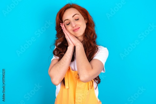 Young redhead woman wearing orange overall over blue background leans on pressed palms closes eyes and has pleasant smile dreams about something