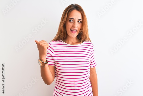 Young redhead woman wearing striped casual t-shirt stading over white isolated background smiling with happy face looking and pointing to the side with thumb up.