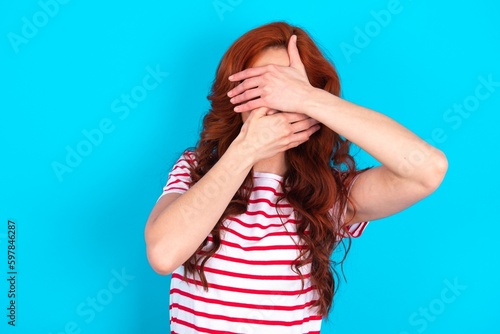 young redhead woman wearing striped T-shirt over blue background Covering eyes and mouth with hands, surprised and shocked. Hiding emotions.