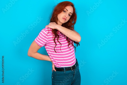 young redhead woman wearing striped T-shirt over blue background got back pain