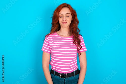 young redhead woman wearing striped T-shirt over blue background nice-looking sweet charming cute attractive lovely winsome sweet peaceful closed eyes