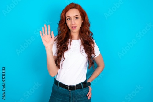 young redhead woman wearing white T-shirt over blue background waiving saying hello or goodbye happy and smiling, friendly welcome gesture.