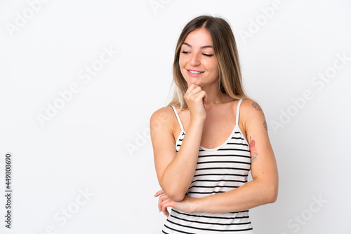 Young Romanian woman isolated on white background looking to the side and smiling